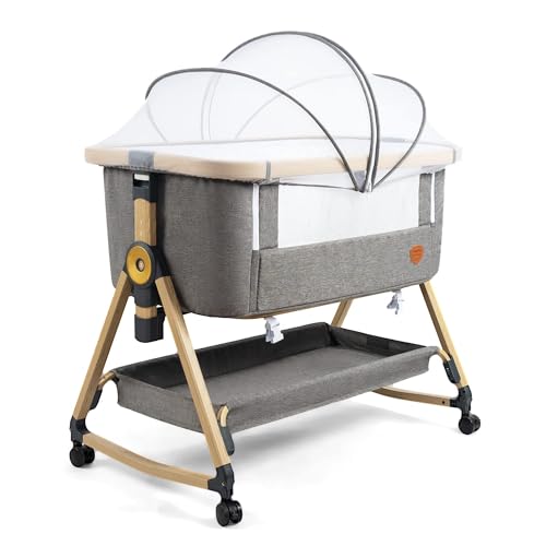 Sidosäng för bebisar, babyvagga, resesäng med hjul, barnsäng, lutbar höjdjustering, barnsäng med mjuk madrass och myggnät (mörkgrå)