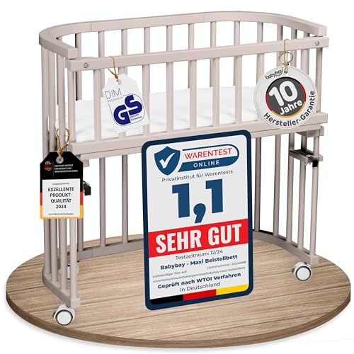babybay Maxi extra stor sidosäng i massiv bok barnsäng, höjd steglöst justerbar och miljövänlig/med madrass, rutnät, hjul (beige-lackerad)