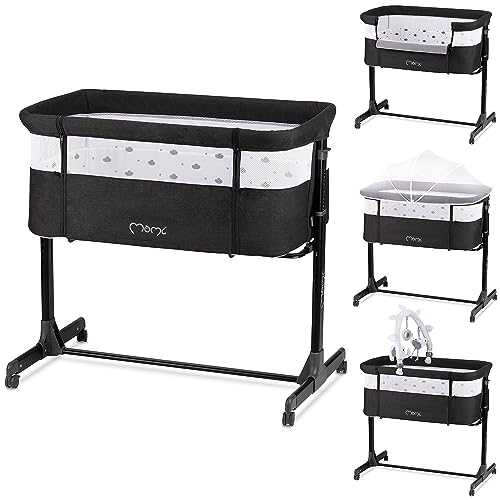 Momi REVO Multifunktionell sido- och barnsäng, justerbar i 6 steg från 72 till 82 cm, med hjul, inklusive madrass, fästremmar, insektsskydd och bygel med leksaker