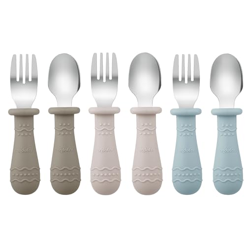 Panda öron småbarnsredskap, 6-pack barnskedar och gafflar, 18/8 rostfritt stål och livsmedelsklassad silikon barn bestick set, diskmaskinssäker (ljusbrun/valnöt/blå)