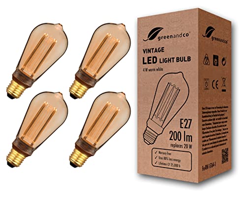 4x greenandco® LED vintage retro glödtråd glödlampa bärnsten Edison stil E27 ST64 4W 200lm 1800K (extra varm vit) 320° 230V glaslampa, ingen flicker, ej dimbar