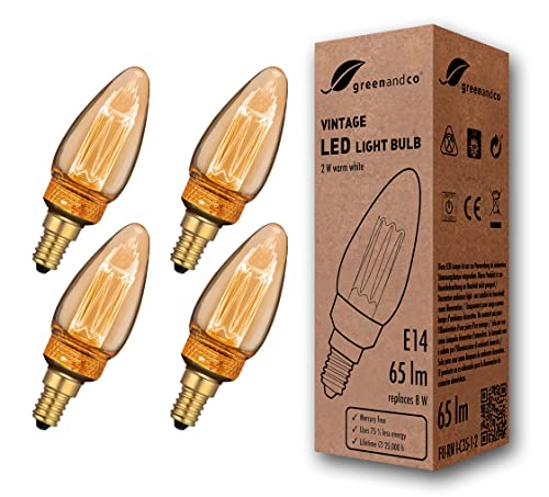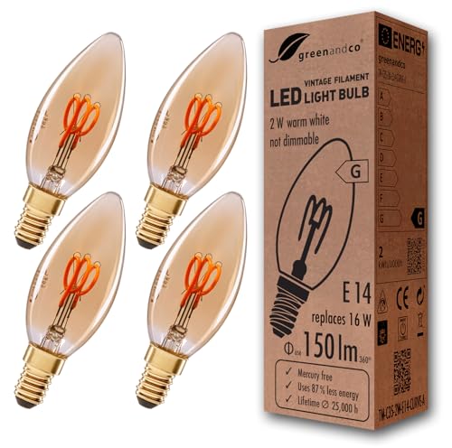 4x greenandco® LED vintage glödtråd glödlampa bärnsten ersätter 16W E14 C35 2W 150lm 2000K (extra varm vit) 360° 230V glaslampa, inte dimbar