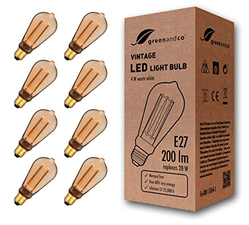 8x greenandco® LED vintage retro glödtråd glödlampa bärnsten Edison stil E27 ST64 4W 200lm 1800K (extra varm vit) 320° 230V glaslampa, ingen flicker, ej dimbar