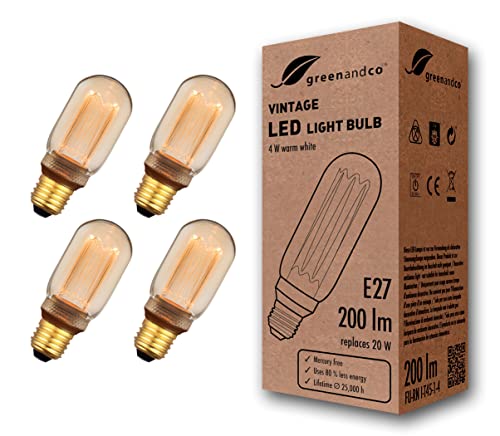 4x greenandco® LED vintage retro glödtråd glödlampa bärnsten Edison stil E27 T45 4W 200lm 1800K (extra varm vit) 320° 230V glaslampa, ingen flicker, ej dimbar