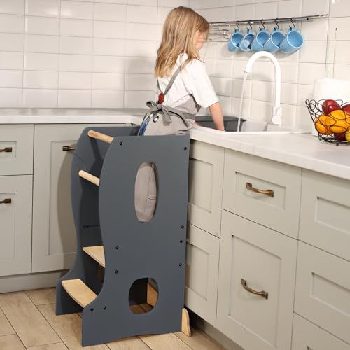Montessori – höjdjusterbar barnstol av trä från 1 år – säkert stående och inlärningstorn för kök, lek och lärande (grafit)