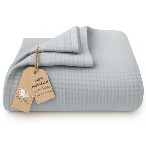 Musselintäcke baby bomull 110 x 120 cm - Filt gasväv mys muslin duk barntäcke tunn babytäcke lindningsfilt pläd lätt andningsbar textil för småbarn Ljusgrå