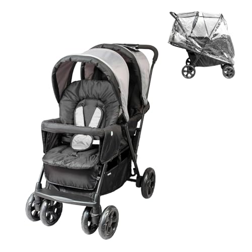 Bambisol Dubbel barnvagn | Helt utrustad, regnklädsel ingår, lätt hopfällbar | Grå svart