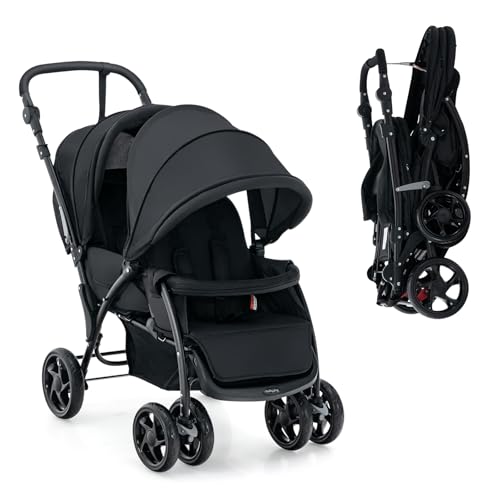VEVOR Dubbel sida vikbar hygger barnvagn med tandemsits, justerbart fotstöd, handtag, wrap-in säkerhetssele, förvaringskorg, för småbarn, svart, Svart, Modern