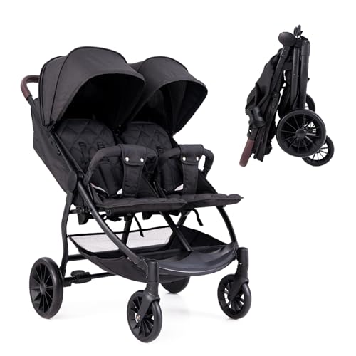 LIFEZEAL Hopfällbar dubbel barnvagn för tvillingar, 3-vägs justerbar barnvagn med 2-sits, spöbarnvagn med mysiga, universalhjul med bromsar, belastning 15 + 15 kg (svart)