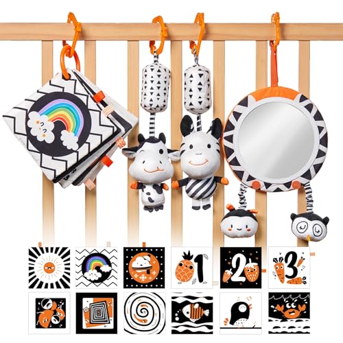 TUMAMA Kontrast Svart Vit Barnvagn Leksak Från 0 2 3 4 6 8 9 Månader, Kontrastbok Pekbok Babybok, Spela Båge Hänge Skallra Greppleksak Med Tyg Bok Vevbok Gåva (4st)