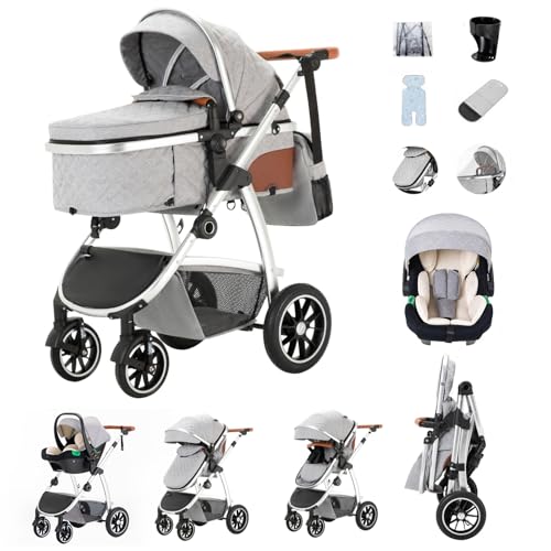 Zkiprm 3-i-1 barnvagn med bilbarnstol, barnvagnar och vagnar, kompakt, bärbar, justerbara armstöd, stötskydd, aluminiumram, ljusgrå