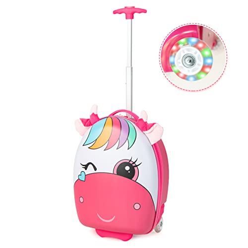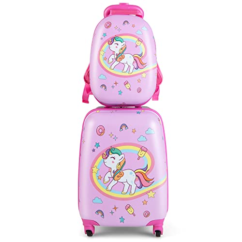 Costway Barnresväska + ryggsäck i 2-delat set, barnvagn av plast, barnbagage, barnresväska i set, handbagage, väska med hårt skal för pojkar och flickor, Enhörning, 12"+16"