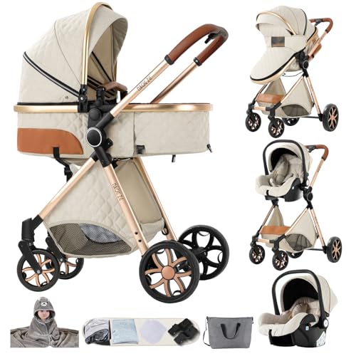 NADDLILY Barnvagn 3-i-1, buggy med vändbar tvåvägs dragkraft, barnvagn med vikbar bärbar enklickdesign, barnvagn 3-i-1 komplett set med tillbehör högt landskap (588 svart guld)