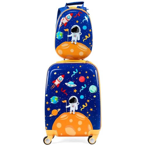 Fantaskk 2-delad barnresväska + ryggsäck, barnvagn av plast, barnbagage, barnbagage-set, handbagage, hårt fodral för pojkar och flickor, astronauter, modern