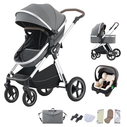 Prokoke Barnvagn 3-i-1, barnvagn set med ett klick vikbar, kombibarnvagn 3-i-1 med vändbar tvåvägs dragkraft, buggy ram aluminiumlegering baby småbarn nyfödda (225 ljusgrå)