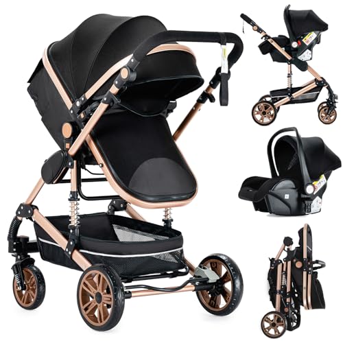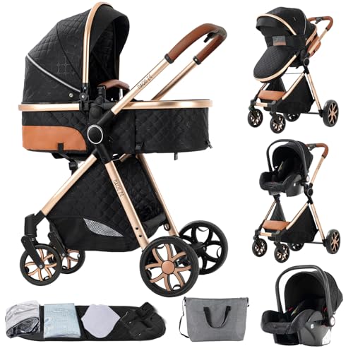 Magic ZC Barnvagn 3-i-1, barnvagn set vändbart dubbelskjutläge, kombibarnvagn 3 i 1 stor bekväm babybadkar, buggy ram aluminiumlegering vikbar högt landskap (739 svart guld)