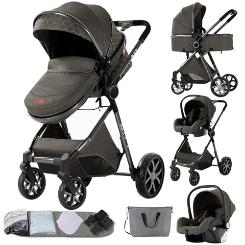 BEBBY Multifunktionell Barnvagn Trio Kombination Barnvagn 3-i-1 Hopfällbar Barnvagn Barnvagn Set Barnvagn Nyfödd Barnvagn Säte Fotstöd Myggnät H2-KHAKI