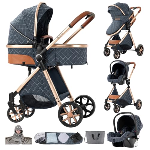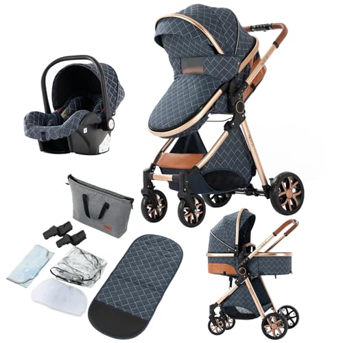 BEBBY Barnvagn 3-i-1, barnvagn buggy med babystol, med höjdjusterbar buggy komplett set vikbar, bärbar, barnvagnar med aluminiumram för nyfödda 0 till 3 år (D2-pack-6, H2-D)