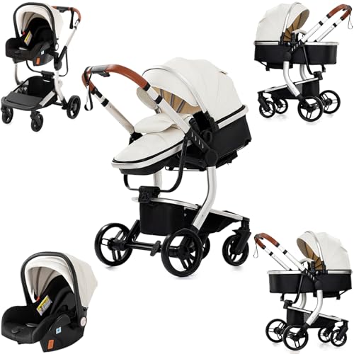 Magic ZC PU-läder barnvagn 3-i-1, barnvagn set vändbart dubbelskjutläge, kombibarnvagn 3 i 1 stor bekväm babybadkar, buggy ram aluminiumlegering vikbar (518 vit)