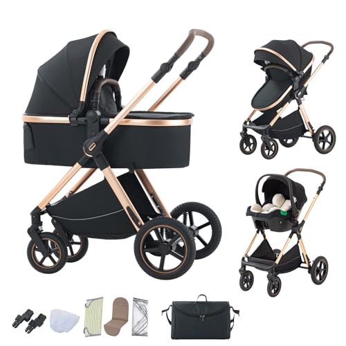 Prokoke Barnvagn 3-i-1, barnvagn set med ett klick vikbar, kombibarnvagn 3-i-1 med vändbar tvåvägs dragkraft, buggy ram aluminiumlegering baby småbarn nyfödda (225 svart)