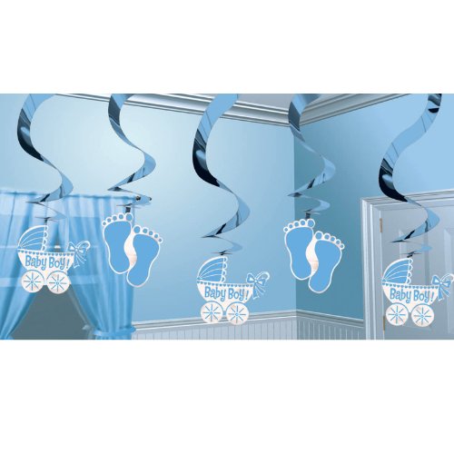 Set om 5 blå hängande dekoration födelsedag fötter barnvagn dop pojke