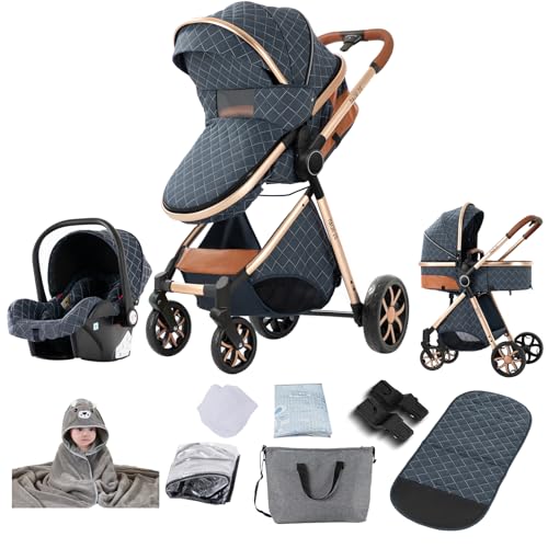 Reenborn Barnvagn 3-i-1, buggy med två vändbara skjutlägen, barnvagn med ram i aluminiumlegering, barnvagn 3-i-1 komplett set med vikbar design på ett klick, hög modell (V9 blå)