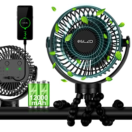 ELZO 1 2 000 mAh barnvagnsfläkt, bärbar fläkt, tyst, med 3 hastigheter, 360° roterande fläkt, USB-uppladdningsbar fläkt, för barnvagnar, kontor, bilstol, tält