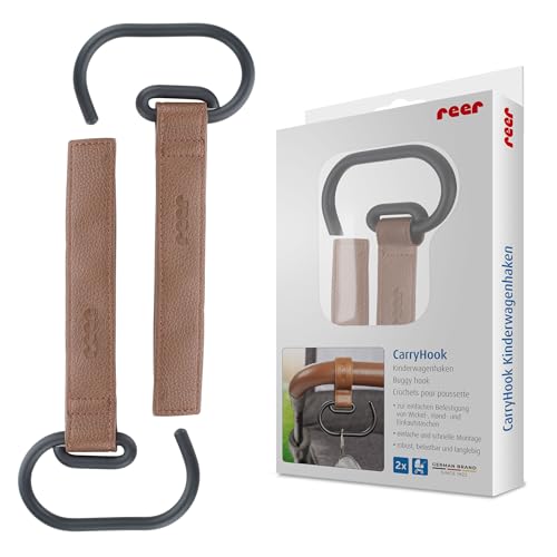 reer CarryHook barnvagnskrokar | 2 stycken | Universella krokar för skötväskor och shoppingkassar | kardborrefäste | barnvagnstillbehör | brun-svart