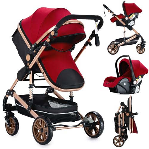 Nine point nine Barnvagnspaket 3-i-1, set med vändbar liggdel, sittdel och babyskydd, dubbelt skjutläge, duovagn med stor och bekväm liggvagn, stomme av aluminiumlegering (739 rött)