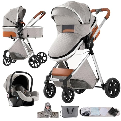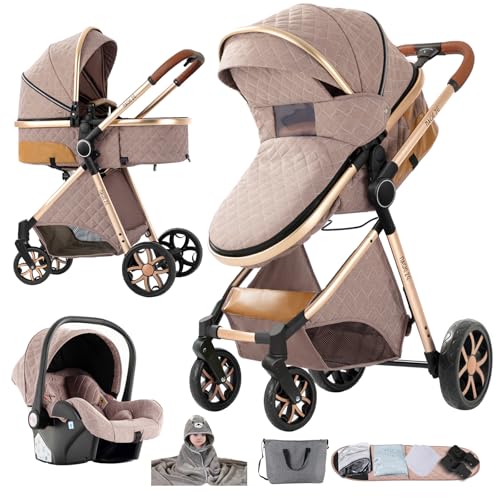 Nine point nine Barnvagnspaket 3-i-1, set med vändbar liggdel, sittdel och babyskydd, dubbelt skjutläge, duovagn med stor och bekväm liggvagn, stomme av aluminiumlegering (739 beige)