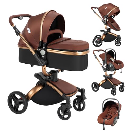 Nine point nine Barnvagnspaket 3-i-1, set i konstläder med 360° vridbar liggdel, sittdel och babyskydd, cabriosits, duovagn med stor och bekväm liggvagn, stomme av aluminiumlegering (906 brunt)
