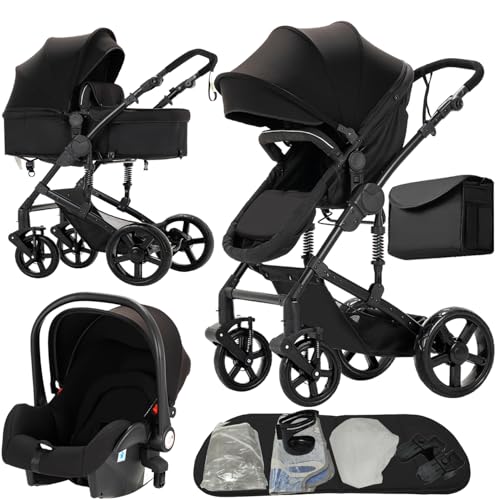 Nine point nine Barnvagnspaket 3-i-1, set med vändbar liggdel, sittdel och babyskydd, dubbelt skjutläge, duovagn med stor och bekväm liggvagn, stomme av aluminiumlegering (588 svart)
