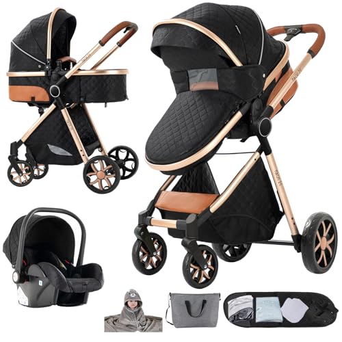 Nine point nine Barnvagnspaket 3-i-1, set med vändbar liggdel, sittdel och babyskydd, dubbelt skjutläge, duovagn med stor och bekväm liggvagn, stomme av aluminiumlegering (588 svart och guld)