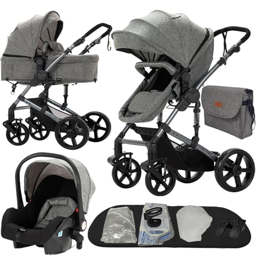 Nine point nine Barnvagnspaket 3-i-1, set med vändbar liggdel, sittdel och babyskydd, dubbelt skjutläge, duovagn med stor och bekväm liggvagn, stomme av aluminiumlegering (V9 grått)