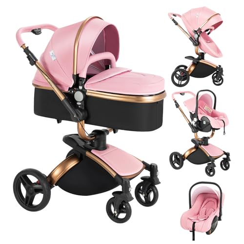 Nine point nine Barnvagnspaket 3-i-1, set i konstläder med 360° vridbar liggdel, sittdel och babyskydd, cabriosits, duovagn med stor och bekväm liggvagn, stomme av aluminiumlegering (906 rosa)