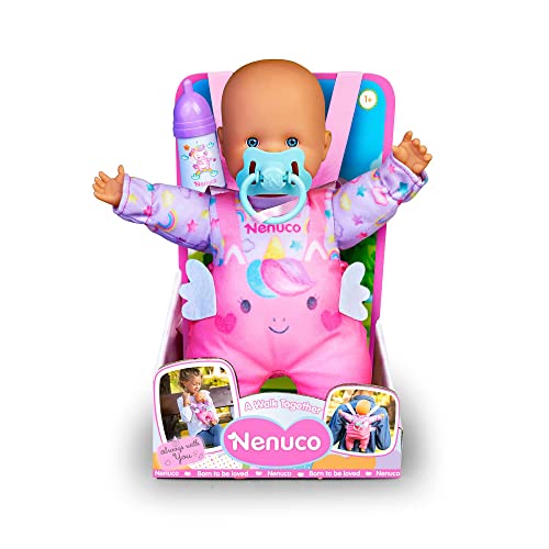 Nenuco - Promenader, babydocka 35 cm med mjuk kropp, tillbehör och bärsele för att ta med dig vart som helst, känslomässig utveckling, barn +1, Famosa (NFN23000)