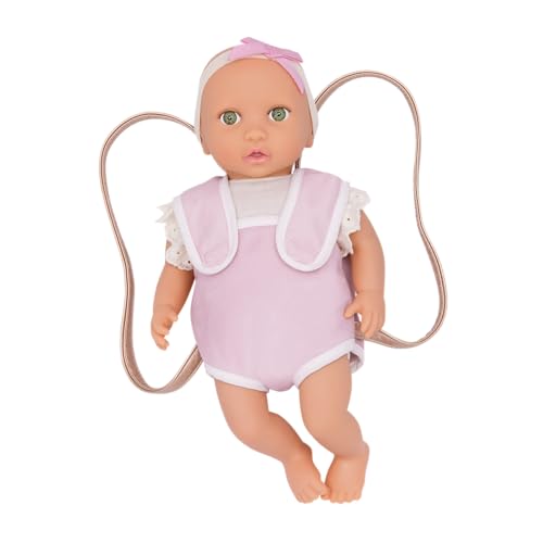 LullaBaby LBY7647Z babydocka med bärsele – porslin hudton och gröna ögon – 36 cm babydocka, mjuk kropp – med dockkläder – leksak för barn från 2 år – rosa, multi