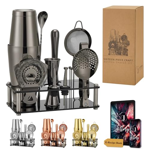 Jettory Boston Shaker Set – 16-delars cocktailshakerset i rostfritt stål med akrylbas, barsil, istång, barsked, mätkopp, flaskpip och cocktailspett (svart)