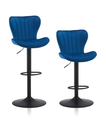 TUKAILAI Barstol uppsättning av 2 sammet, barstol justerbar höjd, 360° roterbar, pall med ryggstöd, fotstöd, metallram, modern skålform kökspall, spall för kök barer, blå