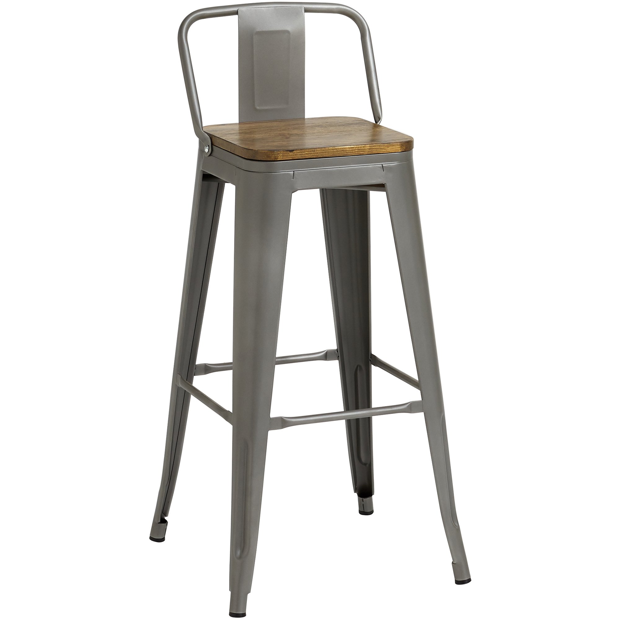 Barstol med ryggstöd & Träsits Industriell design Stålplåt Grå metall & Valnöt Utomhus/Inomhusbruk | Adexa WW62DGW