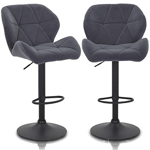 BAKAJI Set med 2 höga barstolar med ergonomisk sits och ryggstöd i sammet, 83–104 cm justerbar höjd pall, metallbas och fotstöd, modern design, mörkgrå