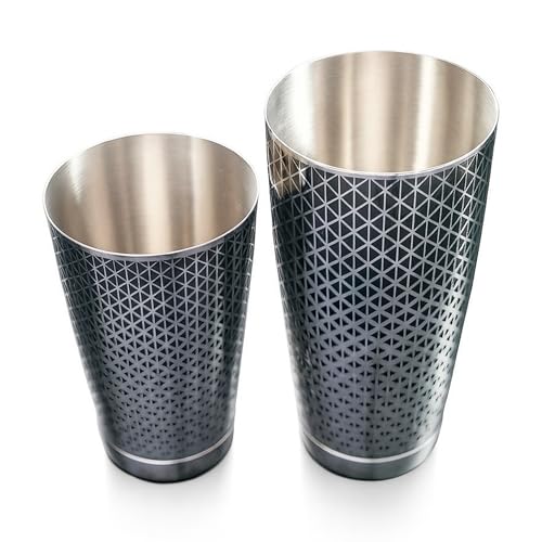 Kidia Boston Shaker Proffs i Rostfritt Stål 304 med Svart Geometriskt Mönster – 2‑delat Tin‑on‑Tin Set 828 ml + 424 ml – Trälåda Inkluderad – Bartender Cocktail‑Set, Hem, Elegant Present