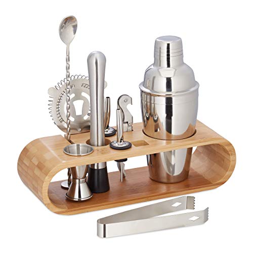 Relaxdays Bartender kit i 9 delar, shaker, mätkopp, muddler, istång, droppkorkar, hållare, bartillbehör, rostfritt