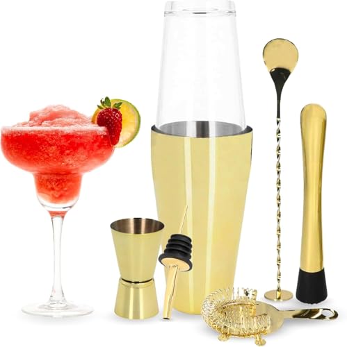 BarDeluxe® Boston Shaker Set 5-delat, Bartender Set, Cocktail Mix Set - 750ml Cocktail Shaker Boston, Cocktail Set Rostfritt stål, Cocktail Tillbehör - Lyx presentset, väska och receptbok (guld)