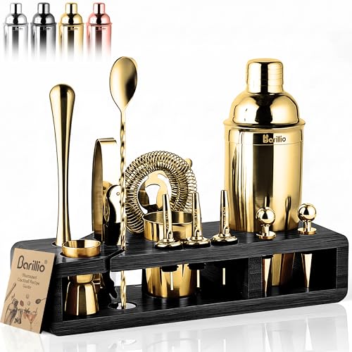BARE BARREL® Cocktail Making Kit | 14-delad bartender kit cocktail shaker set tillverkare | bambuställ & 35 receptkort | Mixology cocktail presentset (800 ml/28 oz Boston Shaker, guld/svart)