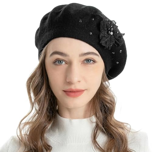 ZLYC Fransk basker för kvinnor, vändbar enfärgad kashmirmosaik varm baskermössa för flickor, Pärla blomma svart, one size