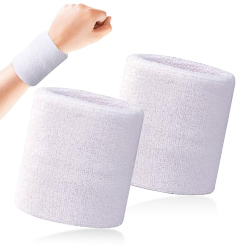 Quelcc 2 stycken svettband vitt, svettband handled, sport svettband armband mjuk förtjockad bomull, svettband för tennis, basket, löpning, gym, träning
