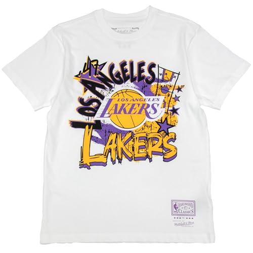 Mitchell & Ness Play by Play kortärmad T-shirt (NBA/HWC), vit, 100 % bomull, män, kvinnor, barn, unisex, vår, sommar, höst, vinter, basket, amerikansk sport, Los Angeles Lakers, XL