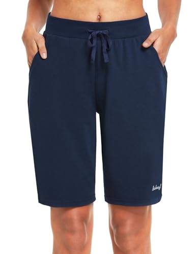 baleaf Dam svettshorts lång bomull Bermuda basket sommar vardaglig träning promenader dragsko shorts med fickor, Marinblått Xsp, M