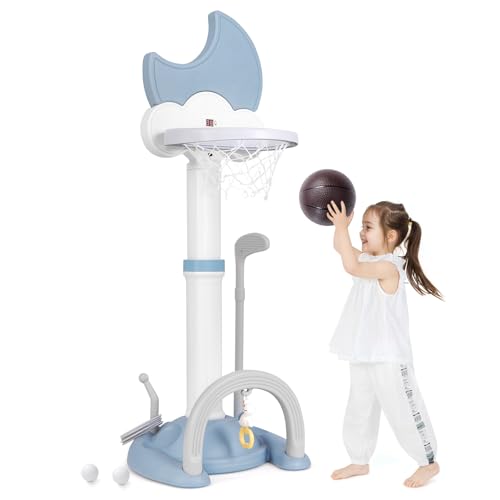 COSTWAY 4-i-1-set för barn, basketkorgsset, basketstativ höjdjusterbart med basketboll och fotboll och ringkast, lekplats för barn med resultattavla, korgställning för barn från 3 år (blå)
